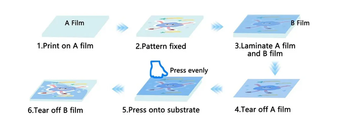 UV A/B Film and DTF Transfer Film differ fundamentally in printing method, transfer process, and application scope. UV A/B Film is based on UV printing with cold transfer, requires no heat press, and is intended for rigid or coated surfaces. DTF Transfer Film uses inkjet printing combined with heat transfer, primarily for textile applications.